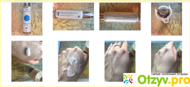Герой отзыва представляет собой белый крем с легким и приятным косметическим ароматом. Консистенция очень нежная, но при этом отлично питает и увлажняет кожу, делая ее прям бархатной на ощупь. Ещё бы, ведь в составе, помимо анонсированной в названии продукта гиалуроновой кислоты, содержатся полезные для кожи масла — миндальное, вечерней примулы, виноградных косточек, а также масло Ши. На официальном сайте позаботились о симпатичной наглядности: