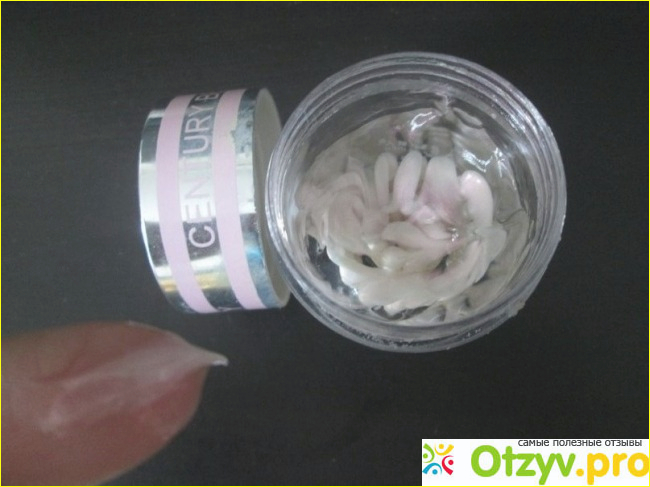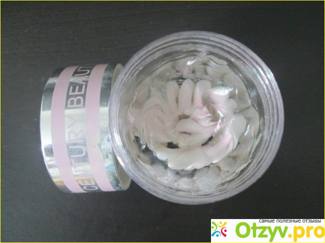 Сама баночка из прозрачного пластика позволяет восхититься внешним видом крема. Он состоит из прозрачного сверкающего геля, внутри которого есть бусики другого геля - жемчужно-розового перламутрового.