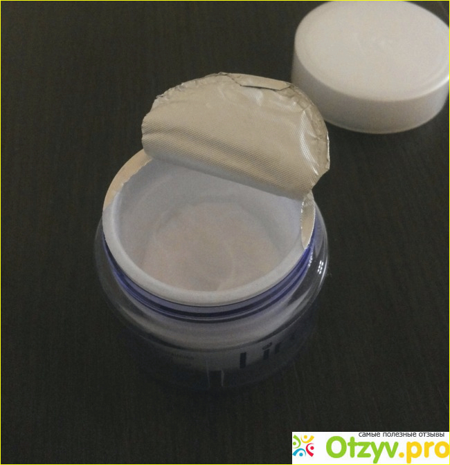 Крем сам непрозрачный белый, достаточно густой, особенно, когда уже некоторое время постоял открытым, то он ещё больше загустевает.