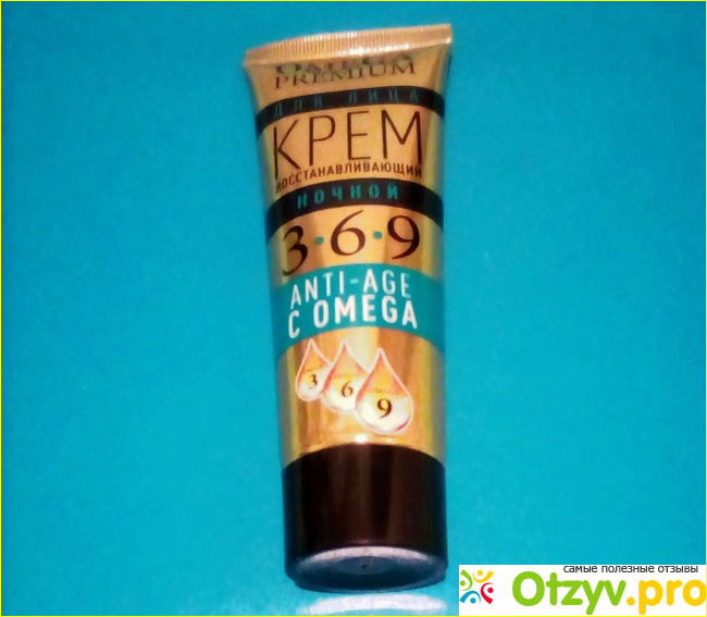 Ну и подумала, крем заодно куплю. К моему удивлению, россыпи ночных кремов я там не обнаружила. Зато увидела один и не устояла. Как сорока, бросилась на красивую золотистую упаковку и утащила к себе в норку. Ой! Не в норку, а в гнездо, а еще точнее, в семейное гнездо. Ладно, думаю, попользуюсь пока, а там другой приобрету, получше. Рассмотрела дома уже. Цена 55 рублей, объем 85 мл. Неплохо! Но какое там может быть качество, за такую-то цену! Хотя цифры 3,6 и 9 мне нравятся. Это значит, что производитель обещает нам, что в составе есть омега 3, омега 6 и омега 9. Ну ладно, буду спать ночью, а он работать будет на благо моей коже.