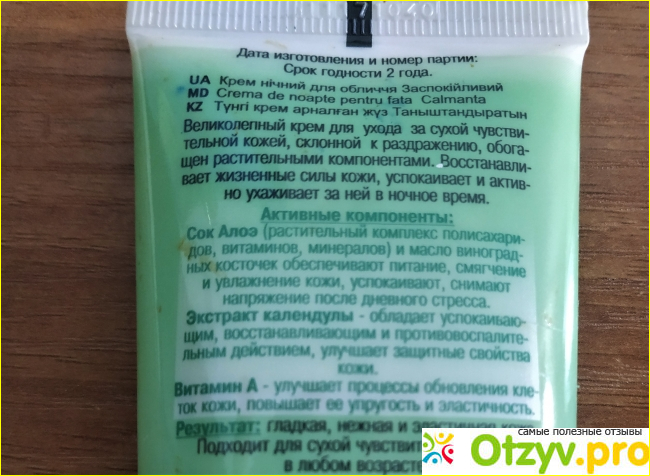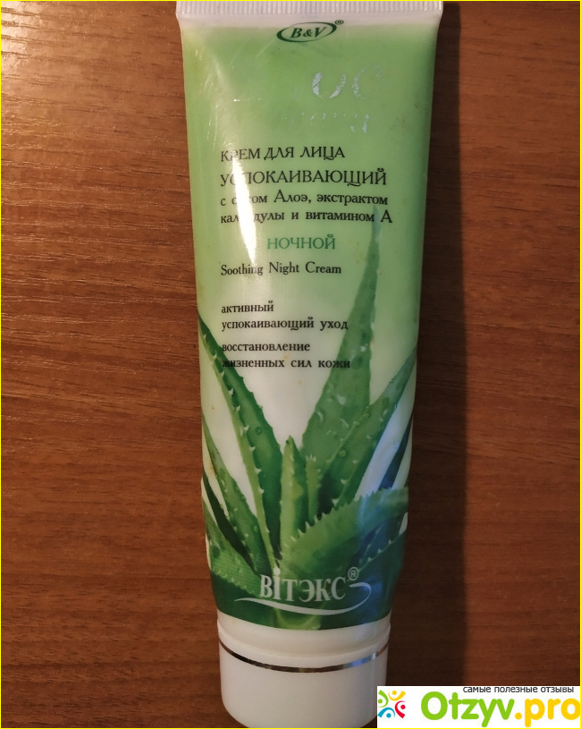 Содержимое крема подходило к концу, когда на лице у меня появилось шелушение. Оно возникло после специального пользования одним из средств, способствующих удалению шелушения рогового слоя кожи. Хотелось быстрее восстановить состояние кожи. Решила воспользоваться для этой цели ночным Кремом для лица ALOE VERA под брендом Vitex с соком алоэ, экстрактом календулы и витамином А, тем более в названии обозначен успокаивающий эффект.