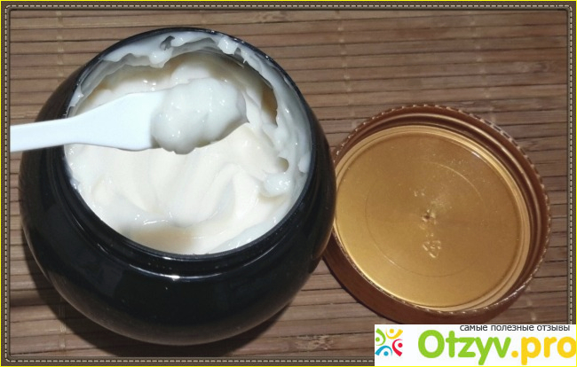 Крышка широкая, с золотистым ободком и с полным названием этого средства. На донышке упаковки есть небольшая скромная наклейка, с написанными сведениями об этом средстве, но, к сожалению, без указания состава этого средства.