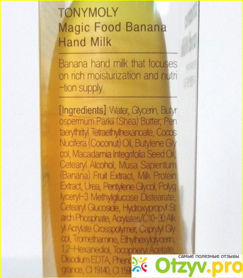 Крем-молочко содержит экстракт банана, молочные протеины, масла кокоса, макадимии, масло ши. Экстракт банана содержит фитостеролы, витамины В, С, Е и кальций. Экстракт банана интенсивно питает кожу, помогает разглаживать морщинки. Масла ши и кокоса делают руки очень мягкими и нежными, восстанавливают естественный защитный барьер кожи, оберегают от УФ-лучей, делают кожу очень мягкой и красивой.