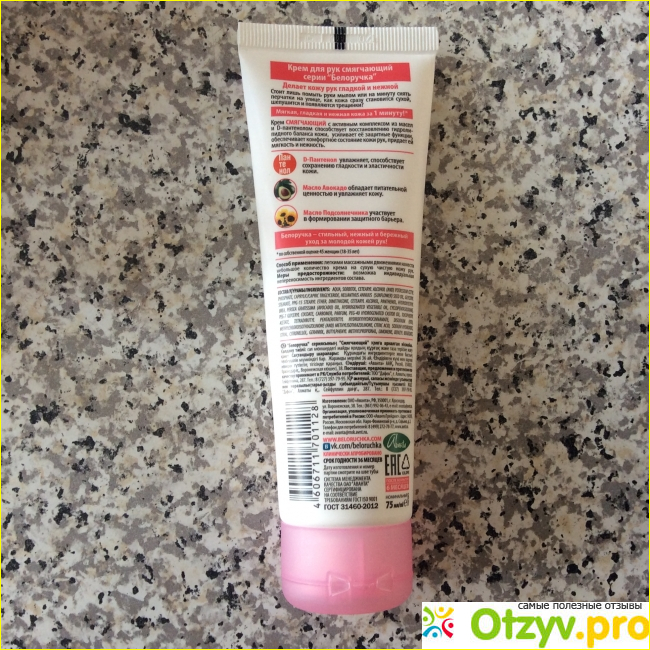 Если повертеть тубу в руках, то можно найти всю необходимую информацию – состав, который своими компонентами не отличается от других аналогов, информация о производителе, которая может пригодиться покупателю, а также подробную информацию о активных компонентах и конечно же все про ожидаемый эффект от ежедневного использования крема для рук.