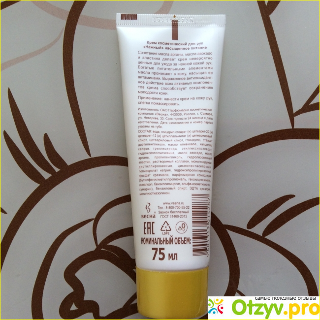 Рассматривая упаковку крема для рук «нежный» стоит отметить, что дизайн упаковки максимально лаконичный, даже немного простоват. Но это совсем не влияет на качество средства. Туба из мягкого пластика, позволяет легко и быстро выдавить нужное количество крема для применения. Она матовая, приятно лежит в руке.