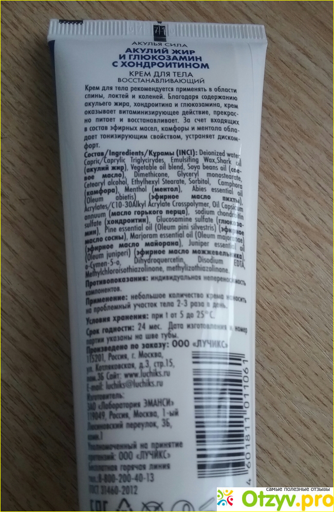 Ранее я неоднократно покупала ему крем просто "Акулий жир". А когда в аптеке мне сказали, что крем "Акулий жир" закончился и давно не поступал в продажу, то я купила крем восстанавливающий "Акулий жир" и глюкозамин с хондроитином. Стоил крем по-моему 104 рубля. Изготовлен крем ЗАО "Эманси", Россия, г. Москва по заказу ООО "Лучикс". Срок годности крема 24 месяца со дня его изготовления. Так как крем был из той же серии, то я в своем выборе не сомневалась. Да к тому же он был рекомендован для натирания в области спины, коленей и локтей, что мне и было нужно.
