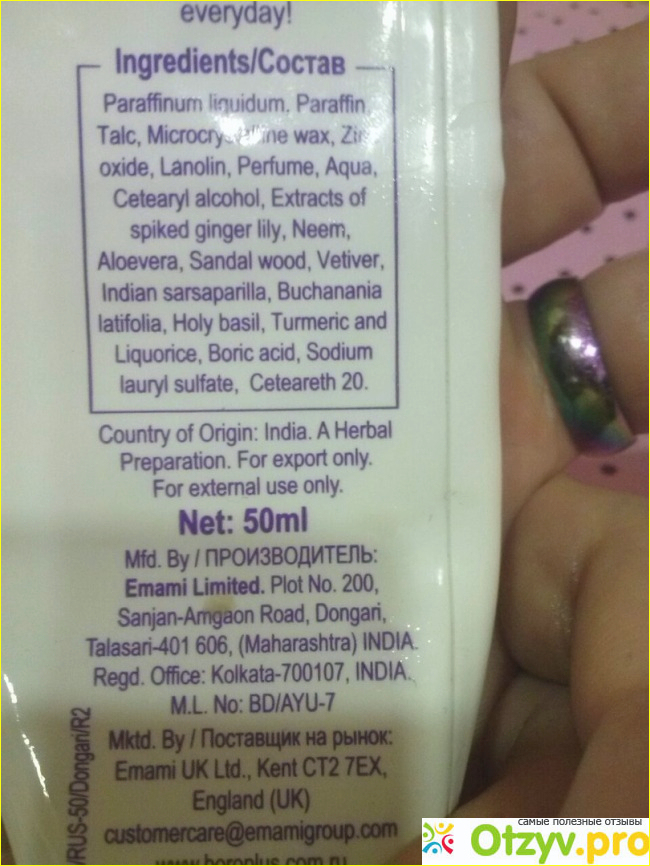 Сначала о самом креме для ухода за кожей Himani Боро Плюс Фиолетовый. Ламинированная туба объёмом 50 мл, что совсем немало, помещается в картонную коробочку. И на тубе, и на коробке можно найти всю интересующую информацию о составе, применении и производителе крема. На упаковке на белом фоне преобладает фиолетовый цвет, крышечка тоже фиолетовая, поэтому крем так и называется. Сам крем очень густой и плотный, ложится толстым слоем, поэтому расходуется весьма экономично. Его требуется совсем чуть-чуть меньше горошины, хотя это зависит от площади обрабатываемой поверхности. Крем довольно жирный и впитывается не сразу, необходимо подождать 5-10 минут. Запах у него, безусловно, своеобразный, не спутаешь ни с каким другим. Он сильно-сильно цветочный, как будто в одно мгновение нюхаешь миллион цветов. Запах сильный, долго не выветривается, поэтому будьте готовы к тому, что он будет сопровождать вас ещё несколько часов.