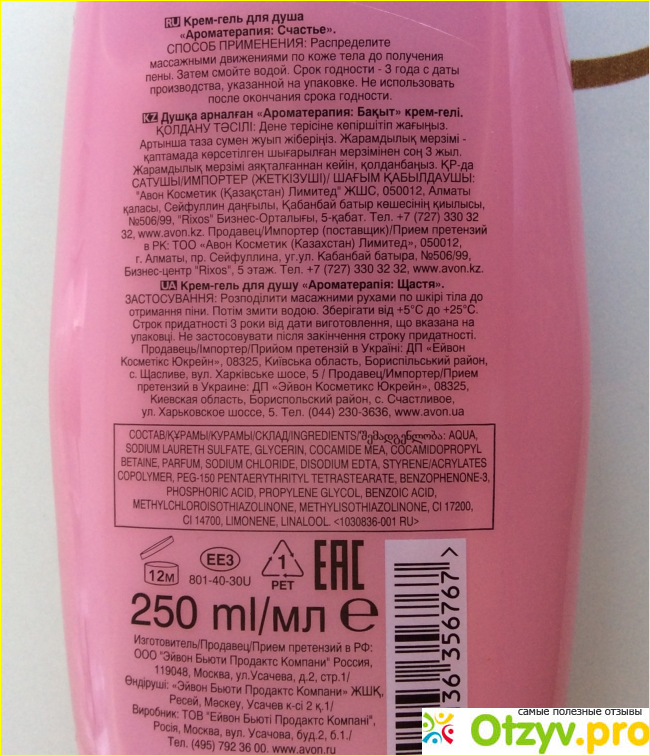 Текстура кремовая, приятная, как и у всех крем-гелей Avon линии SENSES. Цвет нежно розовый, для любителей гламура. Запах из открытого флакона исходил приятный. При купании от ароматерапии ожидаемого "счастья" я не получила, так как ожидала другого запаха. Запах отличается от ароматизированной странички в каталогах. Аромат на коже ощущается долгое время и этот запах меня не устраивает. Гель как гель , помыться можно. Но если есть другой вариант средства для душа, выберу другой. Все дело вкуса.