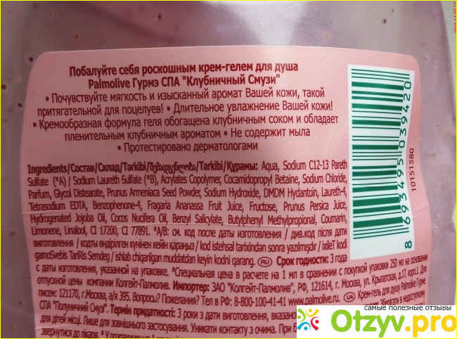 Крем-гель густой с розовым оттенком, написано, что содержит сок клубники и содержит маленькие отшелушивающие частички, которые немного похожи на косточки клубники. Легко и приятно наносится на тело, создавая вокруг волшебный аромат. Частички легко, нежно очищают кожу не причиняя вреда, они не большие, круглые, нежно массируют кожу.