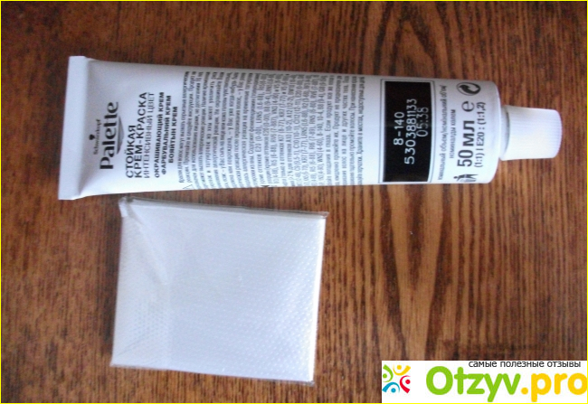 В красочной коробке находятся краска в тюбике объёмом 50 мл, пара тонких полиэтиленовых перчаток для защиты кожи рук в процессе окрашивания в пакетике,