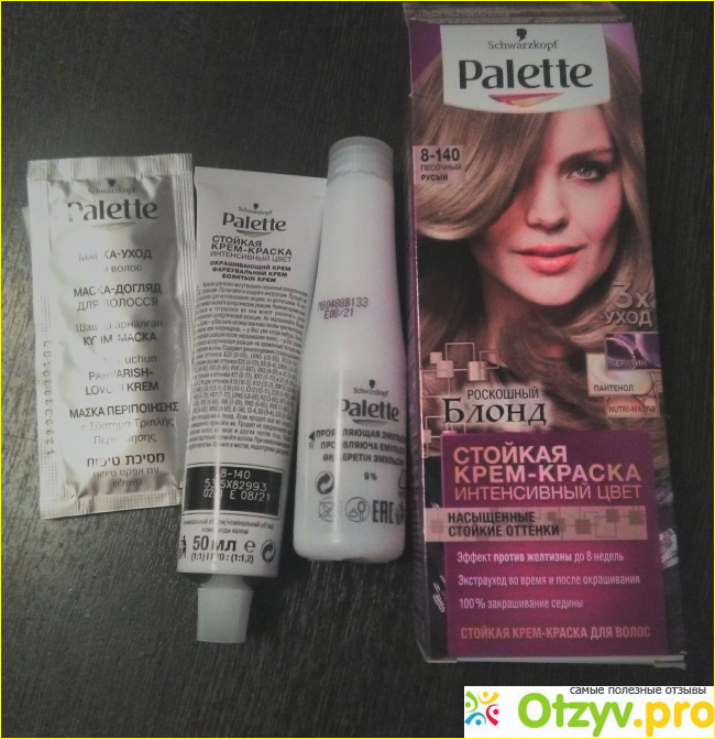 Также, я хотел бы отметить, что в набор крем-краски Palette Интенсивный цвет Песочный русый 8-140 входит не только сама краска, но и маска, эмульсия и стандартные тонкие перчатки. Кроме того, в упаковке есть полная инструкция на нескольких языках. Это очень удобно, так как я всегда окрашиваю волосы сама и знаю, что правильная последовательность нанесения краски на зоны головы очень важна для равномерного и качественного окрашивания.