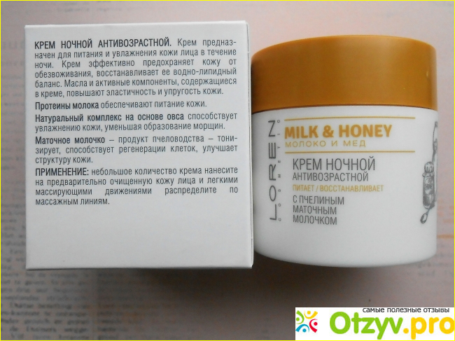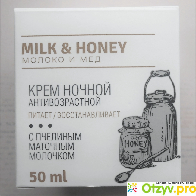 Ночной антивозрастной крем Молоко и мед питает и увлажняет кожу лица, а также повышает ее упругость и эластичность. Спишь, а крем совершает в это время большую работу. Происходит это благодаря содержанию в нем протеинов молока, маточного молочка, комплекса на основе овса, а также натуральных масел - оливкового, жожоба и карите. Производитель обещает, что регулярное использование данного крема способствует замедлению процесса образования морщин, улучшению регенерации клеток.