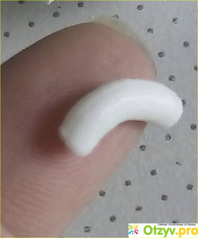 Цвет у крема чисто белый. Консистенция средней густоты, не слишком жирная и плотная. Но и не жидкая. Вот как выглядит полоска крема, она не растекается, держит форму.