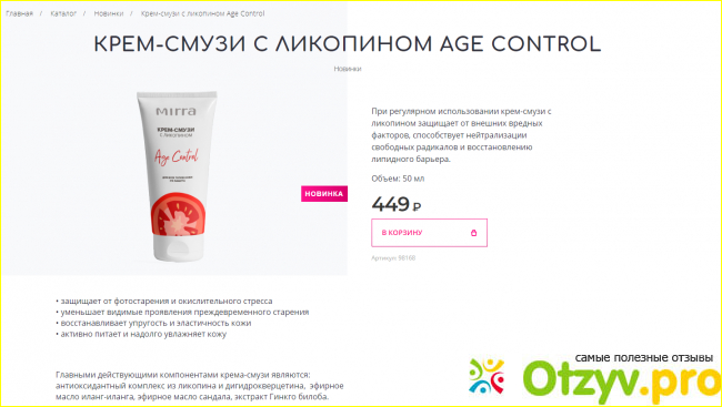В последние годы я перешла на использование натуральной косметики и моментально почувствовала эффект. Увидела новинку у марки Мирра (наша отечественная на эфирных маслах и органических составах) крема-смузи для стареющей кожи. Стоит всего лишь 449 рублей, если не являешься консультантом.