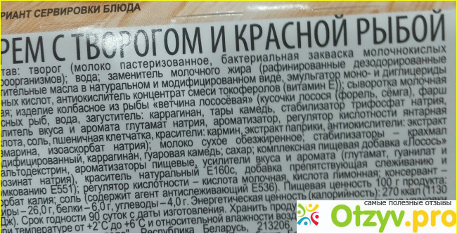 Крем сделан из творога. Он стоит вначале состава, а подробный смотрите ниже на фото.