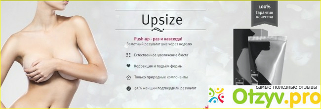 Крем упсайз - это достаточно эффективный крем, благодаря которому, удается быстро и эффективно, восстановить состояние груди и даже увеличить ее. Благодаря данному средству, грудь не просто восстанавливается, она становится больше на пол или даже на один размер. Упсайз не содержит химикатов и действует только за счет натуральных компонентов, что делает крем безопасным. Используя данный крем каждая женщина получает:
