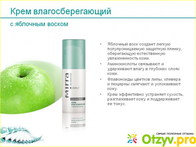Обладает яблочным воском для нежного увлажнения. Этот воск удерживает потерю влаги, восстанавливает естественные силы клеток от разрушения.