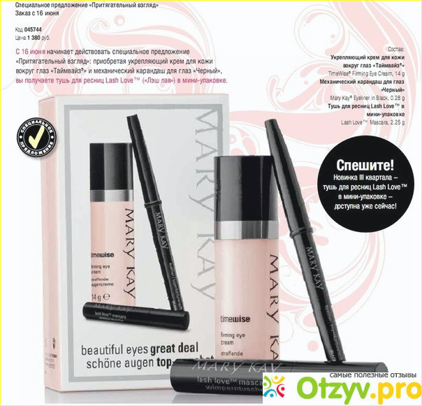Крем для кожи вокруг глаз компании Мэри Кей, под названием TimeWise® предназначен для увлажнения, борьбы с тёмными кругами, укрепления кожи вокруг глаз, а так же для борьбы с возрастными морщинками. Укрепляющий крем для кожи вокруг глаз Таймвайз относится к серии средств, которые разработаны для антивозрастного ухода. В соответствии с рекомендациями разработчиков, данным средством можно начинать пользоваться с тридцати пяти летнего возраста, однако, если состояние кожи плохое, то можно средство начинать использовать и с более раннего возраста.