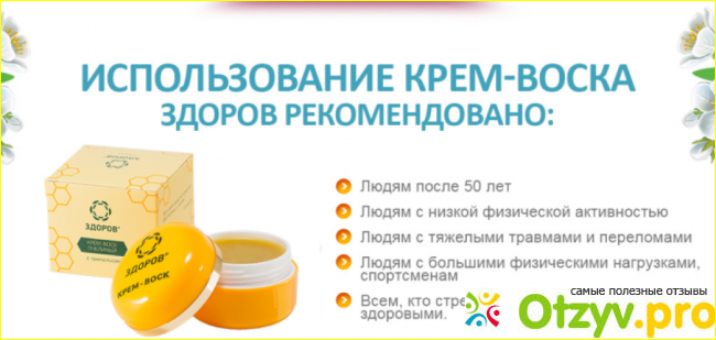Но и это еще не все, покупатели на форуме отмечают то, что крем-воск Здоров от морщин - это препарат для возрастной кожи, так что результативно борется со всеми видимыми проявлениями старения кожного покрова, хвалят его за состав, потому что он создан на основе натуральных продуктов пчеловодства, растительных масле и экстрактов, поэтому не вызывает проблем.