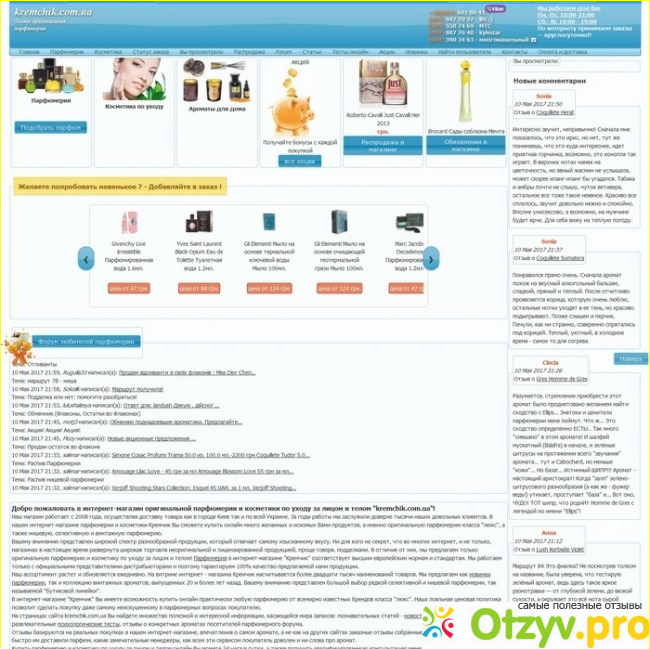 Через интернет они принимают заказы круглосуточно. Так же есть номера на сайте, если есть какие-то вопросы то можете позвонить и уточнить. Тем более на сайте очень выгодные предложения например такие, как доставка бесплатна. Но хочу напомнить только по Украине. Так же продаются духи на разлив. ДУмаю, что так же неплохой вариант. Для украинцев советую интернет-магазин, а для России нет. Еще привлекла акции, скидка была от покупки то ли 30 %, то ли 40%. А кто живет в России думаю, что можно найти тоже неплохой интернет магазин парфюмерии. Сайт сам так-то по себе интересный, так как можно почитать очень интересную информацию про парфюмы, например как определить годность парфюма. Или оригинальный он или нет. И еще есть возможность пообщаться с пользователями сайта их там достаточно много. И можно узнать много информации