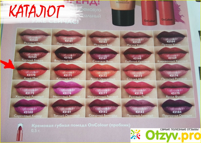 Я насчитала 25 штук. Красных только два: «Алый мак» и «Красный коралл». Дальше оранжевые, розовые, сливовые и прочие оттенки. Разница между ними минимальная. А потому и выбор всё равно ограничен. Выбрала самый яркий! Также отмечу, что эти пробники в этом каталоге наиболее четко передали цвет. В каталоге No9 он чуть-чуть не соответствует. Если не ошибаюсь, печать была немного темнее. По этому предложению я бы точно ничего не заказала.