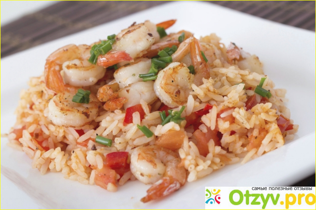 После того как рис будет готовым, добавить в него рубленые креветки и обжаренные овощи, прожарьте все вместе еще в течение 5,5 минут, снимите сковородку с плиты.