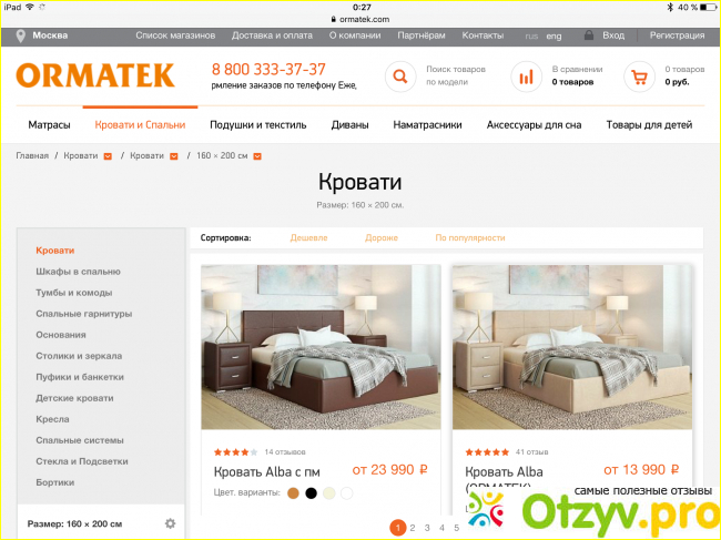 Кровати это крупногабаритный товар, поэтому в салонах Орматек представлены только наиболее популярные модели. Со всем ассортиментом мы ознакомились непосредственно на их сайте. Жаль, конечно, что не удалось, как говорится, ощутить весь ассортимент на "себе". Но это не помешало нам сделать правильный выбор. Благодаря грамотным консультантам мы подробно смогли ознакомится с характеристиками каждого наименования. Стоимость не самая низкая, но ее можно с корректировать благодаря тому, что некоторые детали можно просто убрать из комплектации.