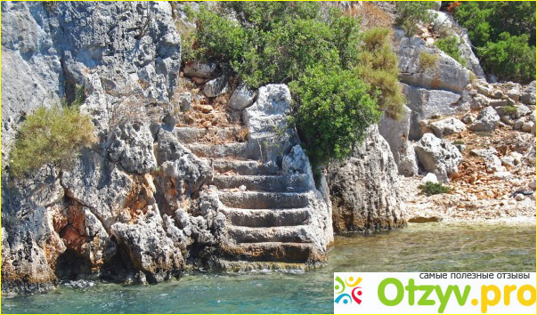 Слева от яхты можно было заметить руины, которые остались от города после сильного землетрясения. Там проживал народ и занимались они преимущественно рыболовлей, но также добывали и золото, поэтому эти места считаются запретными для посещения и никого туда не подпускают после того, как однажды одна группа туристов проникла в эти руины, которые просто заполненные золотом. На скалах можно заметить лестницы, предметы очага, канализационные системы, бани, разрушенные дома, если смотреть в стекло то можно заметить и более мощные застройки, которые ушли в свое время под воду.