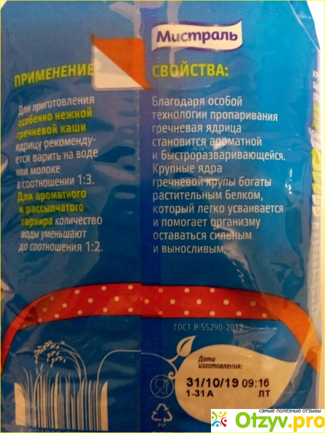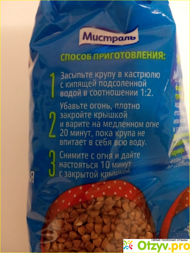 С обратной стороны так же информация о возможности другого способа приготовления, более нежной гречневой каши с расчетом правильного соотношения воды и крупы.