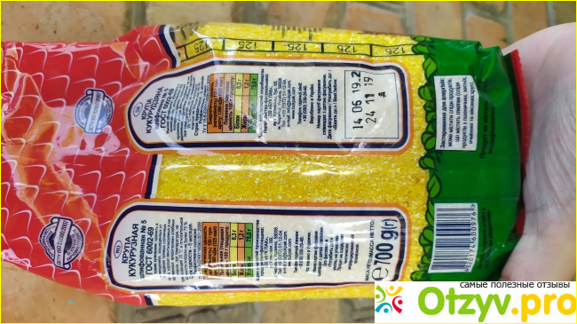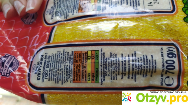 На пачке указана пищевая и энергетическая ценность кукурузный крупы, условия и сроки хранения, а также адрес производителя. К сожалению производитель не указывает способ приготовления, но каша и так готовится очень просто и справиться может каждый. Достаточно всего лишь насыпать небольшое количество крупы в воду и варить до готовности. Я варю в течении 30 минут, затем добавляю кусочек сливочного масла и варю ещё 15-20 минут. Со сливочным маслом каша получается нежная, не сухая и с вкусным сливочным ароматом.