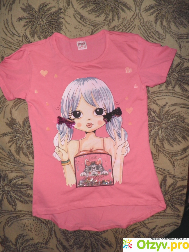 Пошита футболка идеально, соответствует возрастной категории на ярлычке. Стирка только в ручную. Ткань хлопковая, дизайн потрясающий, девчонкам понравится.