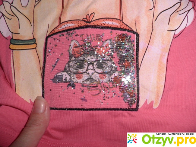 Нигде не встретишь более интересную футболочку, их не много в продаже, стало быть эксклюзивная вещица. Рисунок симпатичной девочки украшен нарисованной шкатулкой, из которой выглядывает котик. Сверху нашита ткань из прозрачной сетки, внутри множество мелких паеток в виде звёздочек, бабочек.