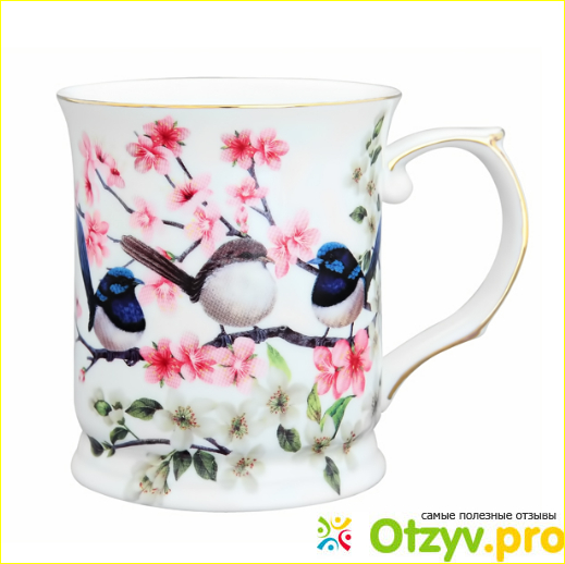Вот, например, кружка, называется "Райские птички". При изготовлении использовали разные цвета: белый, синий и розовый. Это высокая кружка из стопроцентной керамики.