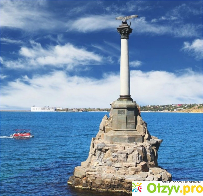 можно увидеть с Севастопольской набережной, выходящим из воды. Его установили в память о том, как избежать столкновения и атаки англо-французского флота были затоплены несколько Российских кораблей. Таким образом графу Меньшикову удалось защитить город от атаки неприятеля, так как он был гораздо мощнее технически.