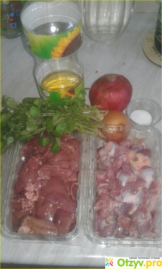 Мой рецепт немного отличается от классического кучмачи-я сделала из куринных внутренностей. Он не такой тяжелый для желудка и менее калорийный. Слово кучмачи с грузинского переводится как желудок и прочие внутренности. Итак исходные продукты-1 кг. куриной печени и по пол килограма сердец и желудков. Одна большая луковица, один гранат, растительное масло и чуть-чуть киндзы для украшения.