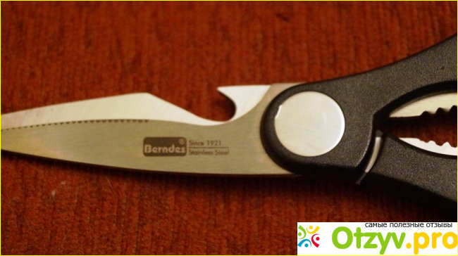 Эти ножницы можно назвать универсальными, а точнее «Три в одном», как принято это сейчас называть. Ими не только можно разделывать рыбу, мясо и птицу и т. д., но можно также поколоть грецкие орехи и даже открыть бутылку с металлической пробкой. Для этого на корпусе ножниц имеются специальные приспособления. А для лучшей работы с твердыми продуктами на одном из лезвий имеются специальные насечки.