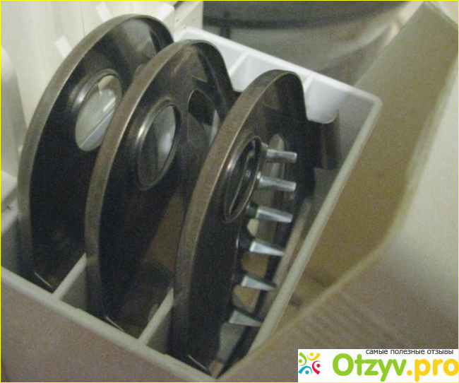 Комбайн также позволяет тереть и резать овощи и колбасу. Ножи для этой насадки съемные, их можно менять. Съемные ножи хранятся в специальном отсеке в корпусе комбайна. О всех функциях комбайна есть информация прямо на корпусе, так что никаких сложностей с использованием не возникает.