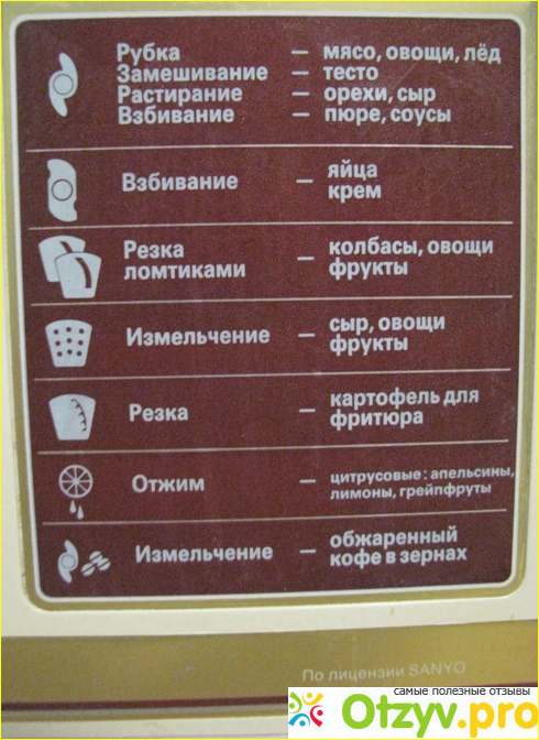 Изготовлен комбайн по лицензии фирмы Sanyo, о чем говорит надпись на корпусе. У комбайна три скорости - от медленной до мгновенной. Я использую самую быструю скорость, когда замешиваю тесто для блинов, а самую медленную - когда делаю фарш для котлет.