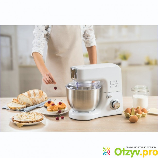 Аппарат состоит из множества частиц, которые помогают в приготовлении пищи, а именно: чаша, крюк для теста, измельчители и лезвия разных размеров, сбивалка, венчик, лопатка, чтобы перемешивать ингредиенты. Сам предмет покрыт прочным пластиком, чаша выполнена из нержавеющей стали (5,5 л), инструкция по использованию. Мощность такого агрегата составляет 1 киловатт. Работает он под напряжением в 220-240 вольт.