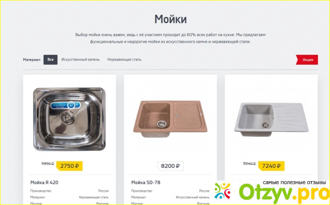 Не будет секретом, что для любой хозяйки на кухне очень важным местом являются мойка. Здесь же представлен большой их выбор на любой вкус. Можно приобрести мойку из искусственного камня или изготовленную из нержавеющей стали, что будет более бюджетным вариантом. Такого большого обилия конфигураций моек, я не видела ни на одном другом сайте. Такое разнообразие поражает, так что любая хозяйка сможет подобрать для себя идеальную мойку.