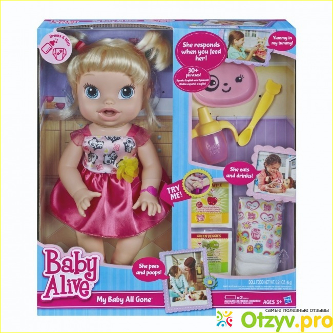 Сама кукла Baby Alive стоит не копейки, так еще и принадлежности к ней дорогие. А без памперсов и еды кукла уже не будет интерактивной, ведь она сама просит покормить ее и поменять памперс.