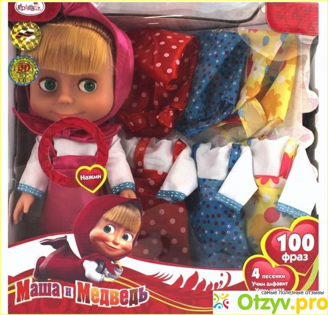 Итак, кукла Маша озвученная, в комплекте прилагаются одежки (яркие красивые, с различными принтами и узорами). Только не думайте, что волосы у нее жиденькие как в мультфильме, нет, у нее густые волосы. Произведена эта кукла в Китае (она качественная, не надо сразу думать, что на следующий день игрушка может сломаться). Более подробная информация об этой кукле: Кукла говорит 100 ФРАЗ от 2 слов до целых загадок, учит цветам алфавиту и счету. Поёт 4 песенки из мультфильма Маша и Медведь, прилагаются 3 комплекта одежды.