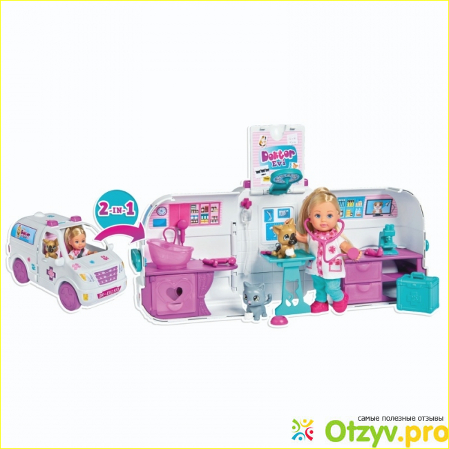 Кукла, собачка, котенок и автомобиль-больница. Таких наборов в нашем детстве не было, к сожалению( Порадовал пластик, он не вонючий, нет зазубрин на нем или каких-то дефектов, приятный на ощупь. Руки ноги у куклы свободно двигаются, не заедают. Одежка у куклы качественная, от многоразового переодевания одежда не растрепалась, липучки не оторвались. Очень много аксессуаров именно доктора, есть и фонендоскоп и микроскоп и чемоданчик доктора.
