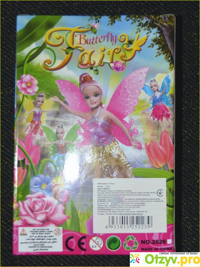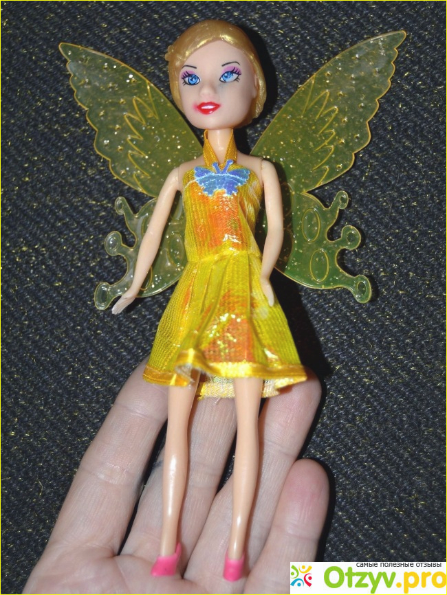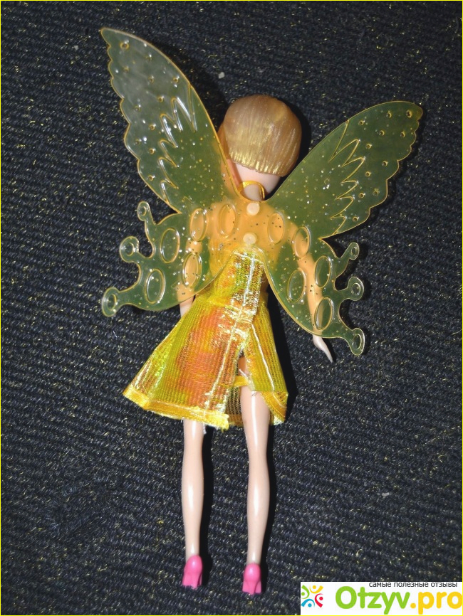 Платье из классического упаковочного материала, как во всех китайских куклах, но ещё не порвалось. И даже есть туфельки, которые не спадают. Крылья резиновые, но с блёсткой. Они могут гнуться в руках, хотя и держатся ровно. Я думала, что они из пластика. Сзади они крепятся к кукле на двух гвоздиках. Проблема в том, что эти гвоздики постоянно выпадают. Мы долго искали их и ставили на место, но на днях успели окончательно потерять. Можно, конечно, поставить на их место маленькие саморезы (или болтики с кассет, если у кого остались), но дочка пока против. Говорит, вообще нужно дырки заклеить и сделать из неё обычного человека.