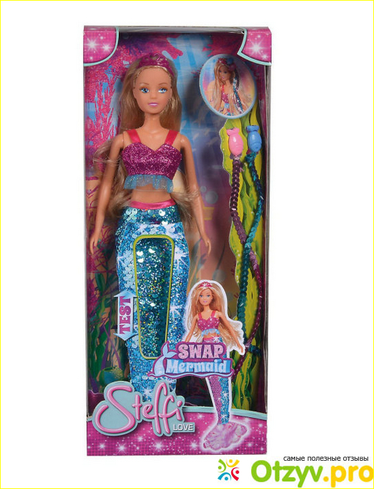 Поэтому я взяла Штеффи, у которой наряд русалки полностью снимается, и при желании куклу можно переодеть во что-то другое. Мне кажется, это расширяет возможности игрушки, когда дети проигрывают разные сценарии, не в одно же морское царство играть! А, кстати, забыла упомянуть, хвост у Штеффи не так прост, как кажется на первый взгляд. В зависимости от того, куда направить пальцем пайетки, он будет либо голубым, либо розовым. Идея - классная!