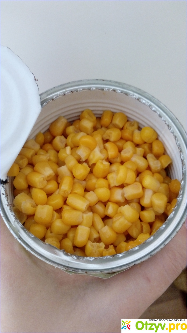 Кукуруза вся целая, нет помятых зёрнышек и кусочков. Мне нравится что эта кукуруза средней жёсткости, не мягкая.