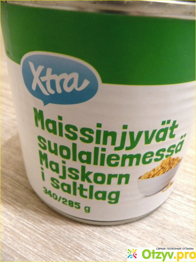 Банка кукурузы белого цвета. Фирменный знак фирмы X-tra. Это фирма специализируется на выпуске недорогих продуктов. Поэтому все консервы этой фирмы дешевые. Эта кукуруза стоит всего каких-то 35 рублей. В сравнении с кукурузой других производителей это же сказочная цена!