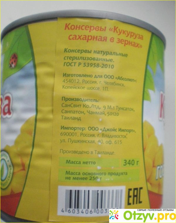 Баночка оформлена достаточно яркой и привлекательной этикеткой и что не маловажно изготовлена данная консервированная кукурузка в соответствии с ГОСТом.