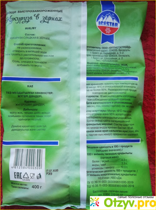 На обороте пачки указан состав и различные способы приготовления кукурузы. Рассматривая упаковку, я отметила, что продукт изготовлен в Беларуси. Я хорошо отношусь к белорусским продуктам, как правило, они отличаются высоким качеством. Но фирма “Icestar” является исключением.