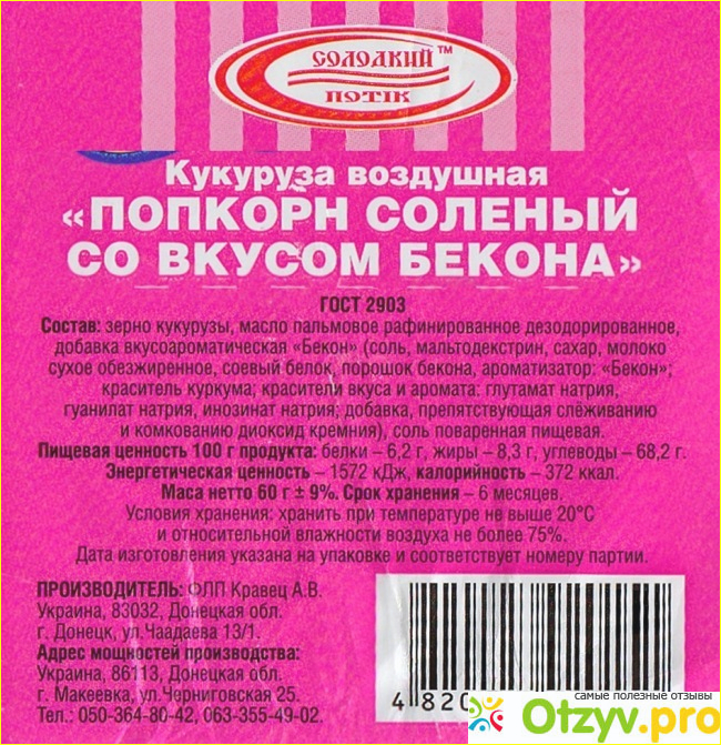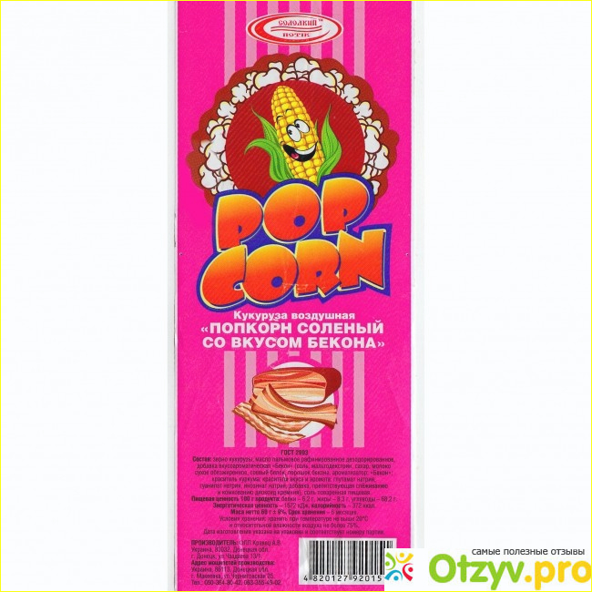 Уж не знаю, были ли другие вкусы, поскольку «бекон» - последнее, что бы я взяла, имея выбор. Но всё оказалось не так плохо. Упакован он в прозрачный пакет, так что содержимое легко рассмотреть до покупки. Этикетка представляет собой ленту и впаяна в швы пакета. Произведено в Донецкой области, а именно в Макеевке. Мне уже кажется, что половина нашего рынка (майонезы, колбасы, снеки, молочка, и много чего ещё) производится в Макеевке. И ведь не плохие же продукты. Попкорн оказался очень вкусным. У него приятный аромат, прожаренный и насыщенный. Цвет золотисто-желтый. А вид аппетитный. Так и тянется рука!